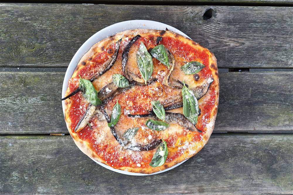 32 cm. Tomaat, geroosterde aubergine, basilicum, knoflook, extra vergine olijfolie en ricotta salata.